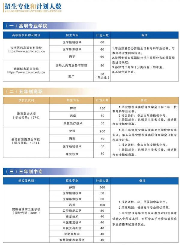 多元办学,让学生有更多选择,拥有更多出彩机会。经安徽省教育厅批准,安庆医药高等专科学校在我校设立医药专业学院,共建专科药学、医学检验技术、医学影像技术3个专业;滁州城市职业学院在我校开设淮南专业学院,共建专科助产、婴幼儿托育服务与管理2个专业。高职专业学院招收参加对口升学(分类升学)的考生,由省教育厅统一录取,在我校学习,毕业生和高等专科学校本部毕业生同等待遇。